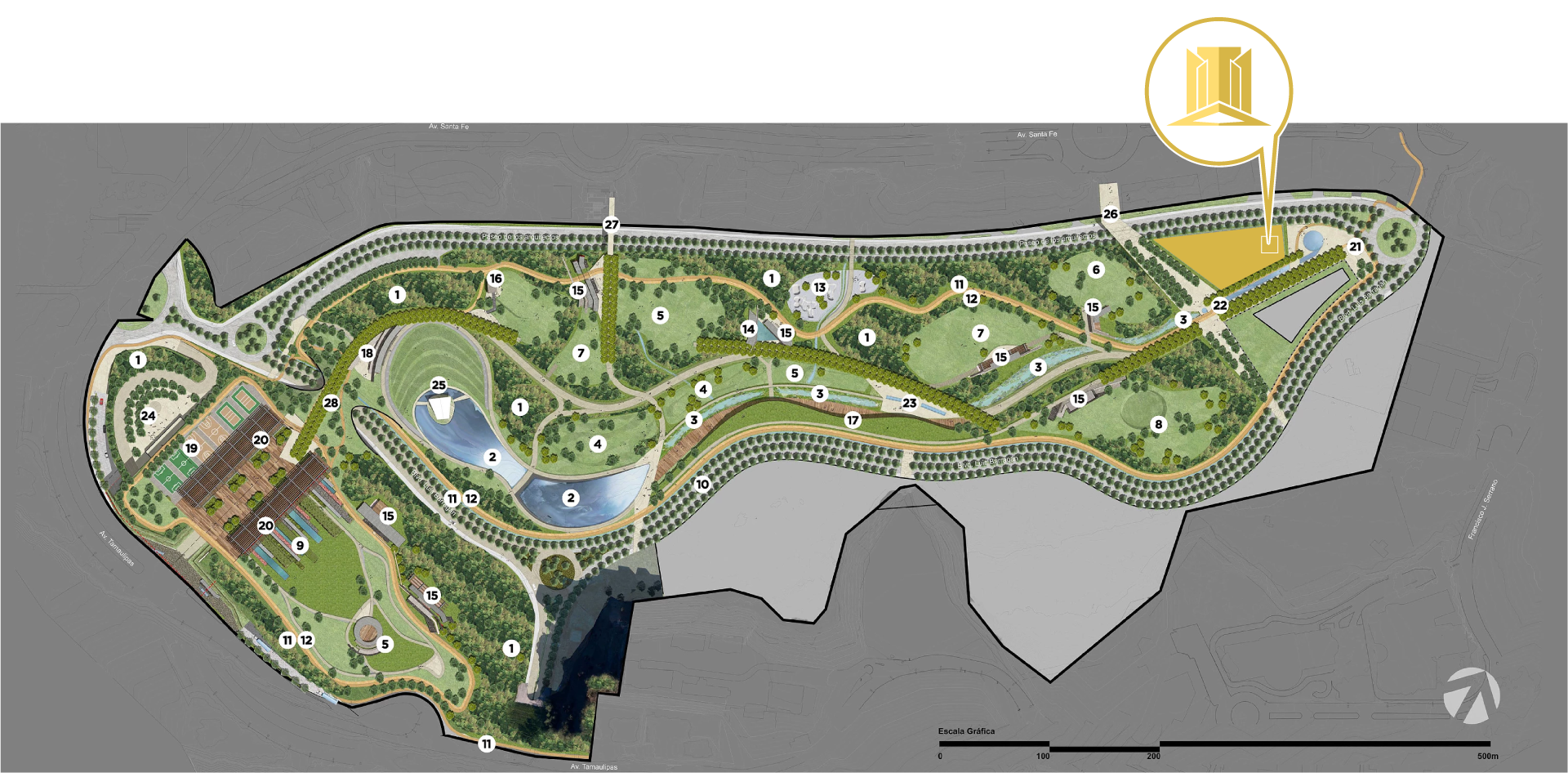 Enclavado en la zona de mayor desarrollo urbano y comercial, a unos metros de la nueva autopista México-Toluca y del Centro Comercial Santa Fe, nacerá un espacio verde de más de 22 hectáreas que será un ejemplo urbanístico y arquitectónico en el mundo.